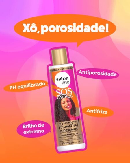 O Acidificante Antiporosidade S.O.S Cachos De Repente Pronta! equilibra o pH da fibra capilar, combatendo agentes externos.