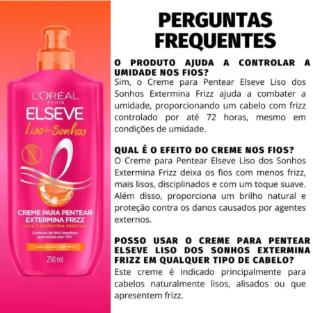 Esse creme ajuda a controlar o frizz mesmo em dias úmidos? Sim, o Creme Para Pentear Elseve L’Oréal Extermina Frizz oferece proteção contra a umidade, ajudando a manter os fios mais controlados e livres do frizz, mesmo em dias com clima úmido.