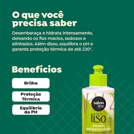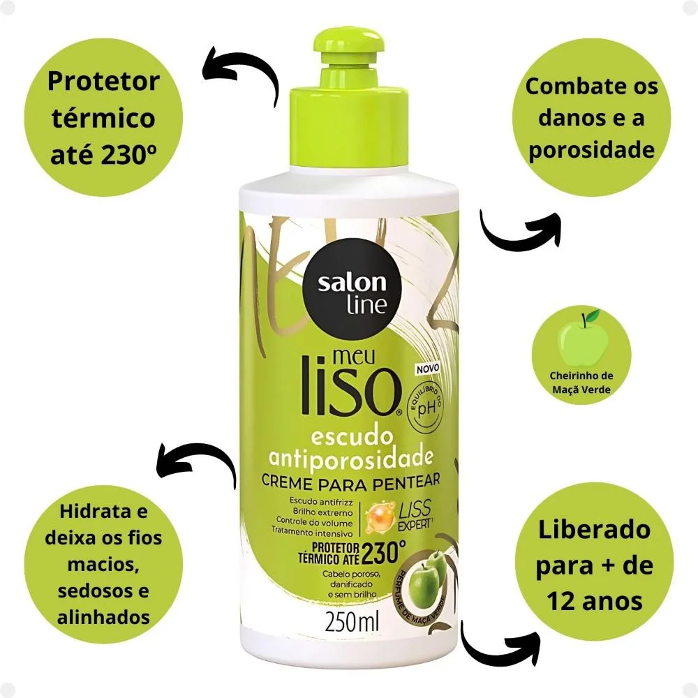 O Escudo Antiporosidade Meu Liso da Salon Line é o cuidado essencial para quem quer manter os fios lisos alinhados, hidratados e com brilho extremo, sem aquele aspecto áspero ou ressecado. Com tecnologia inteligente e ação imediata, ele atua como um verdadeiro “escudo protetor” contra a porosidade, tratando profundamente a fibra capilar.