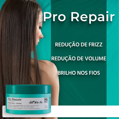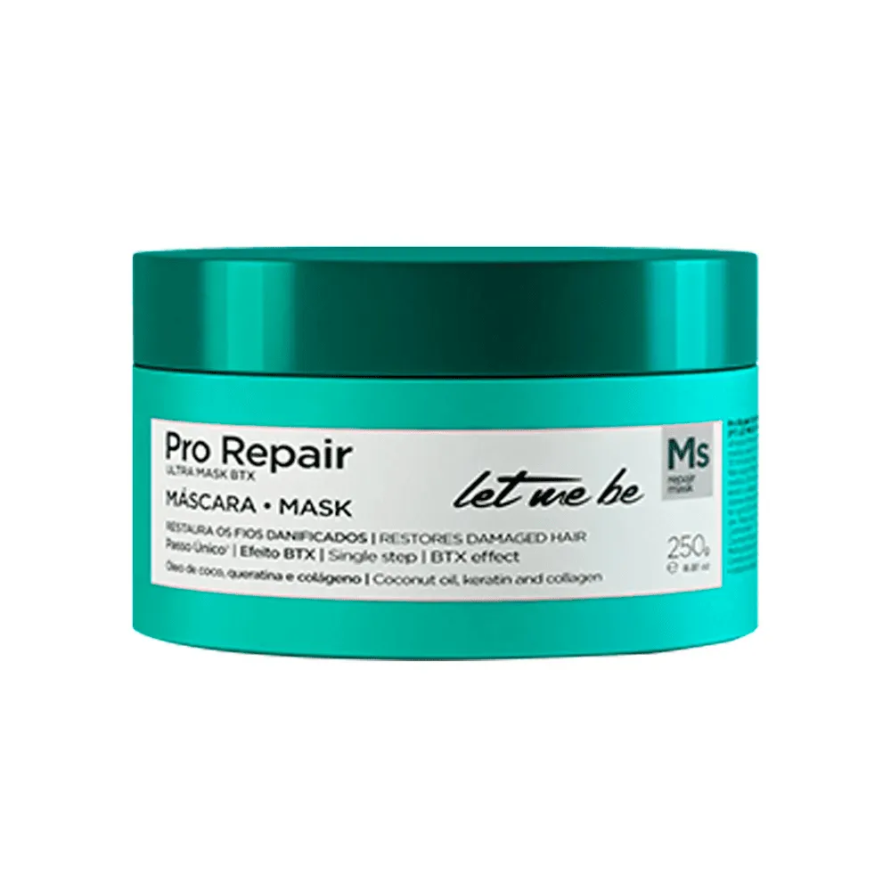 A máscara Let Me Be Pro Repair Mask 500g possui formulação rica em óleo de coco, queratina, colágeno e polímero condicionante de alta performance, que sob ativação térmica restaura os fios extremamente danificados.