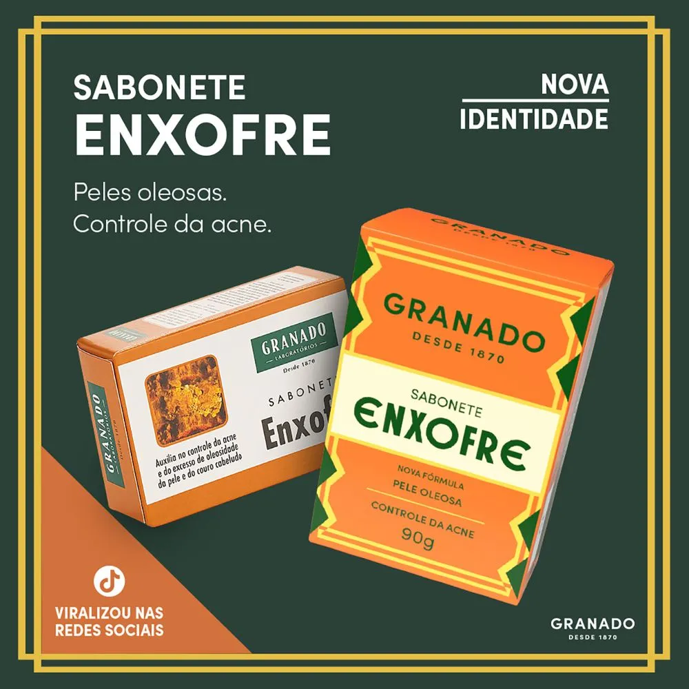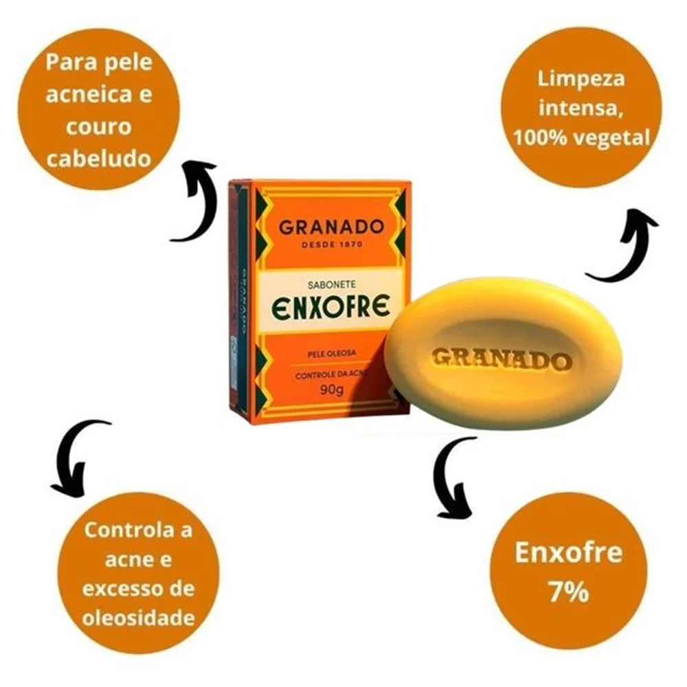 Sabonete Enxofre Granado de tratamento indicado para pele acneica e para o couro cabeludo com médio/baixo graus de oleosidade.